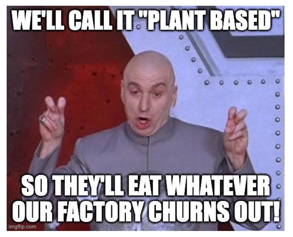 Dr. Evil: âOf course not. What would be the point? We canât manufacture plants! But we can manufacture food-like substances, and label them PLANT BASED. Weâll use sugar, flour, vegetable oil, and chemicals to concoct beige slop in giant vats. The factories will squeeze it out like Frosty the Snowman pooping out snow cones. Power bars, salad dressing, baby formula, canned soup, you name it. Weâll put this ultra-processed âvegetableâ oil in everything. My evil genius food engineers will create perfect, irresistible snacks. The losers wonât be able to say no, and the whole world will get hooked on our Frankenfood. Frau Farbissina, turn on the giant screen.â